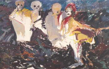 Totentanz (aus dem Weblexikon Wikipedia) Der Totentanz ist die seit dem 14. Jahrhundert aufgekommene bildliche Darstellung der Gewalt des Todes über das Menschenleben in einer Reihe von allegorischen Gruppen unter dem Bild des Tanzes. 14. Jahrhundert Einer der frühesten bekannten Totentänze entstand 1463 wohl unter dem Eindruck der Pest in der Marienkirche von Lübeck. Dieses von einem unbekannten Künstler gestaltete Gebilde in der so genannten Totentanzkapelle wurde leider im 2. Weltkrieg zerstört. Ursprünglich bildete der Totentanz den Stoff zu dramatischer Dichtung und szenischer Aufführung und wurde in kurzen, meist vierzeiligen Wechselreden zwischen dem Tod und anfangs 24 nach absteigender Rangfolge geordneten Personen verarbeitet. Wahrscheinlich war darin den sieben makkabäischen Brüdern mit ihrer Mutter und Eleasar (2. Makk. 6, 7) eine hervorragende Rolle zugeteilt, und es fand die Aufführung an deren Gedächtnisfest zu Paris im Kloster der unschuldigen Kindlein (aux Innocents) statt; daher der in Frankreich von alters her übliche lateinische Name Chorea Machabaeorum (franz. la danse Macabre). In Paris war bereits 1407 die ganze Reihe jener dramatischen Situationen nebst den dazugehörigen Versen an die Kirchhofsmauer des genannten Klosters gemalt, und hieran schlossen sich bald weitere Malereien, Teppich- und Steinbilder in den Kirchen zu Amiens, Angers, Dijon, Rouen etc. sowie seit 1485 auch Holzschnitt- und Druckwerke, welche die Bilder und Inschriften wiedergaben. Noch erhalten ist der textlose, aber die Dichtung illustrierende Totentanz in der Abteikirche von La Chaise-Dieu in der Auvergne, dessen Ursprung in das 14. Jahrhundert hinausreichen mag. Reime und Bilder des Totentanzes verpflanzten sich von Frankreich aus auch nach England; die mannigfaltigste und eigentümlichste Behandlung aber ward ihm in Deutschland zu teil, wo er mit wechselnden Bildern und Versen in die Wand- und Buchmalerei überging. Eine Darstellung in einer Kapelle der Marienkirche zu Lübeck, deren niederdeutsche Reime teilweise erhalten sind, zeigt den Totentanz noch in seiner einfachsten Gestalt: 24 menschliche Gestalten, Geistliche und Laien in absteigender Ordnung, von Papst, Kaiser, Kaiserin, Kardinal, König bis hinab zu Klausner, Bauer, Jüngling, Jungfrau, Kind, und zwischen je zweien derselben eine springende oder tanzende Todesgestalt als verschrumpfte Leiche mit umhüllendem Grabtuch; das Ganze durch gegenseitig dargereichte und gefasste Hände zu einem einzigen Reigen verbunden und eine einzelne Todesgestalt pfeifend voranspringend (vgl. "Ausführliche Beschreibung und Abbildung des Totentanzes in der Marienkirche zu Lübeck", Lübeck 1831). Aus dem 14. Jahrhundert (vielleicht von 1312) rührt der jetzt verwischte Totentanz im Kreuzgang des Klingenthals, eines ehemaligen Frauenklosters der Kleinstadt Basel (Bilder und Reime bei Maßmann: "Baseler Totentänze", Stuttgart 1847) her. Hier ist die Zahl der Personen um einige neue, aus den niedern Ständen genommene vermehrt, auch das Ganze in einzelne Paare aufgelöst. Ein anderer wiederholt gedruckter Totentanz mit 37 tanzenden Paaren ("der doten dantz mit figuren") zeigt sowohl in den Figuren als in den Strophen Nachahmung der erwähnten französischen Danse Macabre. 15. Jahrhundert Seit Mitte des 15. Jahrhunderts werden die Bilder des Totentanzes immer mehr vervielfältigt, während die Verse wechseln oder ganz weggelassen werden, und zuletzt gestalten sich beide, Bilder und Verse, völlig neu. Zunächst wurde der Totentanz von Kleinbasel nach Großbasel, vom Klingenthal an die Kirchofsmauer des Basler Predigerklosters (nicht vor der Mitte des 15. Jahrhundert) übertragen, wobei Zahl und Anordnung der tanzenden Paare dieselbe blieben, aber am Anfang ein Pfarrer und ein Beinhaus und am Ende der Sündenfall hinzugefügt wurden, während die das Ganze beschließende Person des Malers vielleicht erst Hans Hug Kluber, welcher 1568 das Bild restaurierte, anhängte. Bei dem Abbruch der Kirchhofsmauer 1805 ist das Original bis auf geringe Fragmente zu Grunde gegangen; doch haben sich Nachbildungen nebst den Reimen erhalten, namentlich in den Handzeichnungen Em. Büchels (bei Maßmann a. a. O.). Der zum Volkssprichwort gewordene "Tod von Basel" gab neuen Anstoß zu ähnlichen Darstellungen, obschon die Dichtkunst den Stoff ganz fallen ließ. So ließ Herzog Georg von Sachsen noch 1534 längs der Mauer des dritten Stockwerks seines Dresdener Schlosses ein steinernes Relief von 24 lebensgroßen Menschen- und drei Todesgestalten ausführen, ohne Reigen oder tanzende Paare und nach Auffassung wie nach Anordnung durchaus neu und eigentümlich. Dieses Bildwerk ward bei dem großen Brand von 1701 stark beschädigt, aber wiederhergestellt und auf den Kirchhof von Neustadt-Dresden übertragen (abgebildet bei Nanmann: "Der Tod in allen seinen Beziehungen", Dresd. 1844). Von der Basler Darstellung abhängig ist das aus dem 15. Jahrhundert herrührende Gemälde in der Predigerkirche zu Straßburg, welches verschiedene Gruppen zeigt, aus deren jeder der Tod seine Opfer zum Tanz holt (abgebildet bei Edel: "Die Neue Kirche in Straßburg", Straßburg 1825). Aus den Jahren 1470-90 stammt der Totentanz in der Turmhalle der Marienkirche zu Berlin (hrsg. von W. Lübke, Berlin 1861, und von Th. Prüfer, das. 1876). Einen wirklichen Totentanz malte von 1514 bis 1522 Niklaus Manuel an die Kirchhofsmauer des Predigerklosters zu Bern, dessen 46 Bilder, die jetzt nur noch in Nachbildungen vorhanden sind, bei aller Selbständigkeit ebenso wohl an den Basler Totentanz wie an den erwähnten "doten dantz mit figuren" erinnern. Ausschnitt aus dem Holzstich "Totentanz" (Hans Holbein der Jüngere 1538). Holbein verdeutlichte, dass die Pest weder Stand noch Klasse kannte. Eine durchaus neue und künstlerische Gestalt erhielt aber der Totentanz durch Hans Holbein den Jüngeren. Indem dieser nicht sowohl veranschaulichen wollte, wie der Tod kein Alter und keinen Stand verschon