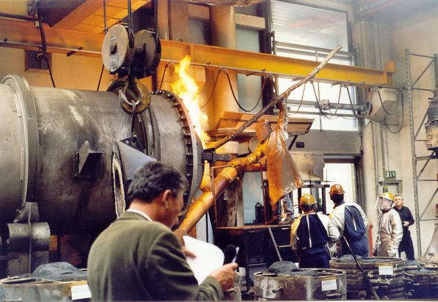 Vor dem Anstechen des Ofens wird ein Probeguss gemacht. Wenn dieser gelungen ist, wird der Ofen angestochen und die erforderliche Menge an flüssigem Metall in das Gussgefäß abgefüllt.