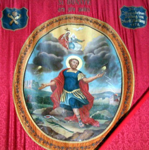 Auf der anderen Seite ist der hl. Donatus als römischer Soldat dargestellt, der Helfer gegen Blitz und Hagel. Oberhalb befindet sich eine Darstellung der Dreifaltigkeit. |