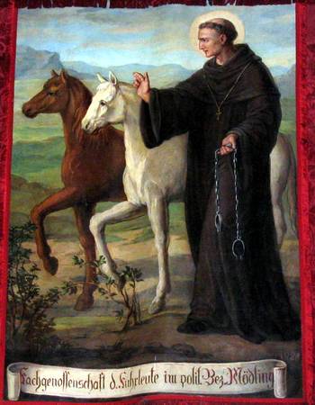 Rechts vom Altarraum befindet sich eine Fahne der Fuhrleute mit folgenden Aufschriften: 17 S. OTHMARE ORA PRO NOBIS 73 Fachgenossenschaft d. Fuhrleute im polit. Bez. Mödling Die Fahne stammt aus dem Jahr 1773, die Bilder jedoch aus der Zeit 1860 bis 1900. Die Fahne wurde nach 1982 restauriert. Während sich die Aufschrift auf den hl. Othmar bezieht, dürfte es sich in der bildlichen Darstellung mit Pferden und Kette um den hl. Leonhard von Noblat handeln. Dieser gilt u.a. als Schutzpatron der Gefangenen und der Fuhrleute. Information über den hl. Leonhard... Auf der Rückseite der Fahne befindet sich eine Darstellung der hl. Barbara mit der Aufschrift: Laudet sanctissimum altaris sacramentum Information über die hl. Barbara... |